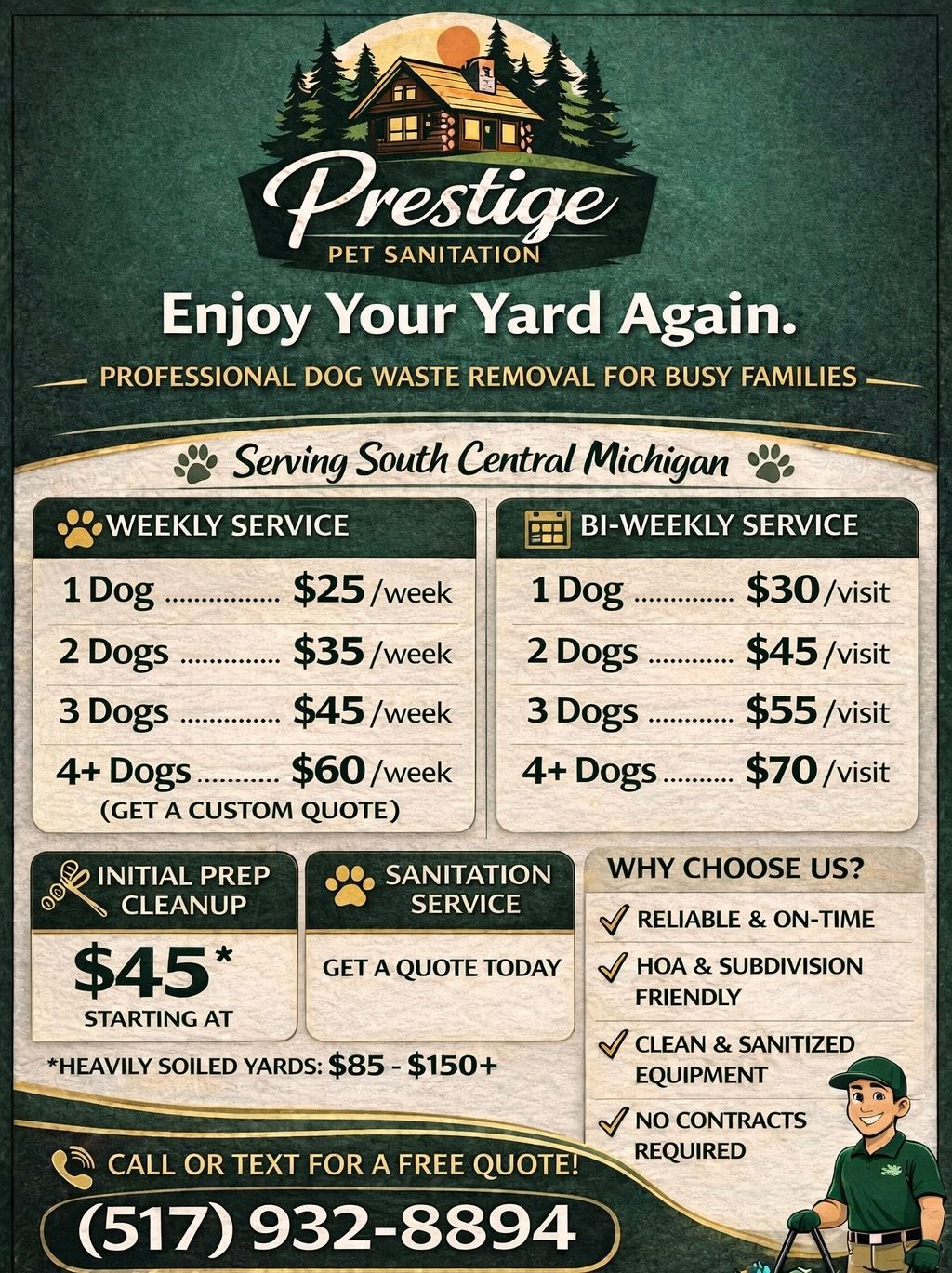 At Prestige Pet Sanitation, we specialize in providing efficient and reliable pet waste management services for homeowners. Our mission is to help you maintain a clean and fresh lawn without the hassle of dealing with pet waste. We offer a range of services including weekly, biweekly, and monthly dog waste removal, ensuring that your yard remains pristine. Additionally, our yard deodorizer treatments are safe for kids, pets, and grass or turf, making them perfect for kennels and more. Trust us for discreet and dependable service that keeps your outdoor space enjoyable.